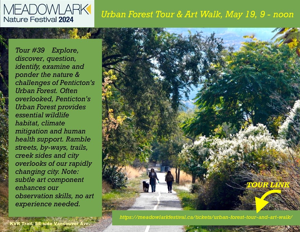 Urban Forest Tour and Art Walk, Tour #39 Meadowlark Nature Festival. Explore, discover, question, identify, examine and ponder the nature and challenges of Penticton’s Urban Forest…the planned and unplanned Green Infrastructure of our city environment. Often overlooked, Penticton’s Urban Forest provides essential wildlife habitat, climate mitigation and human health support. With biologist Lia McKinnon (tree interpretation); Forest Bathing facilitator, Joanne Scofield (short sensory tune-up), and; Penticton Trees FB advocacy group founder, artist, Nature Wise columnist Dianne Bersea…we’ll ramble streets, by-ways, trails, creek sides and city overlooks of our rapidly changing city. Join us to experience some of the best and not so successful elements of Penticton’s natural environment. Note: this event includes subtle art component to enhance our observation skills, but absolutely no art experience required.